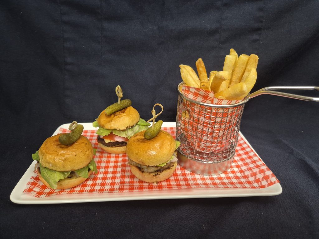 A Trio of Sliders (mini burgers) include a yummy beef slider, a stunning crispy chicken slider and a delicious pulled pork and coleslaw slider.